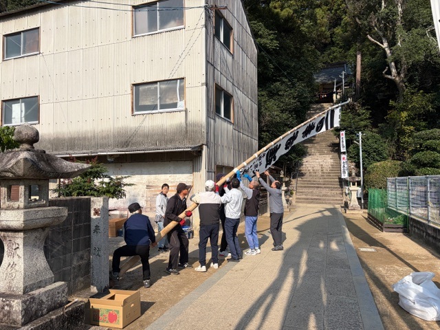高さ10メートル近い幟竹(のぼりだけ)を慎重に倒し、幟を外します。