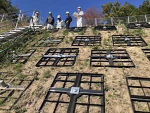 工事では、法面にアンカー鉄筋を挿入し地山に定着させ、地表面では鋼製
