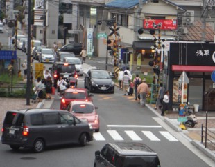 毘沙門踏切は、JR緑井駅や周辺の商業施設への往来により歩行者が多く