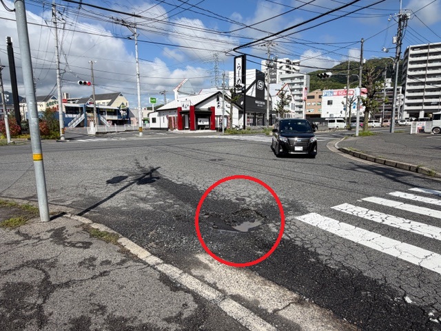 安佐南区川内にお住まいの方から、道路に大きな穴ぼこがあり危険な状態